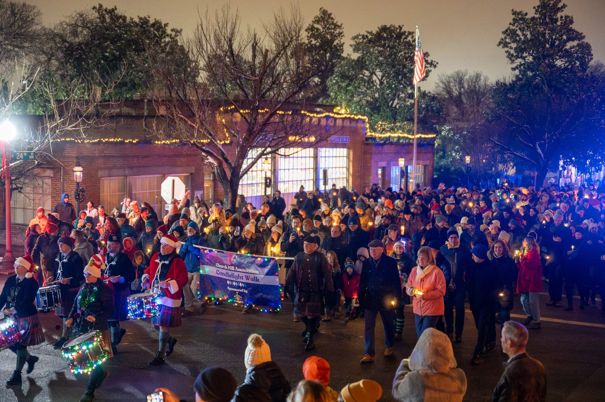 On Friday evening, neighbors gather for the Candlelight Walk led by the Greater Richmond Pipes & Drums. Participants walk from Jefferson Park to Libby Hill Park carrying candles (provided by CHA or brought from home). The evening ends with food trucks, warm drinks, and a visit from Santa.